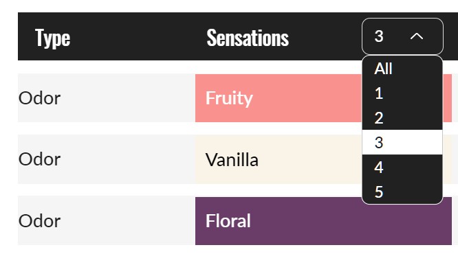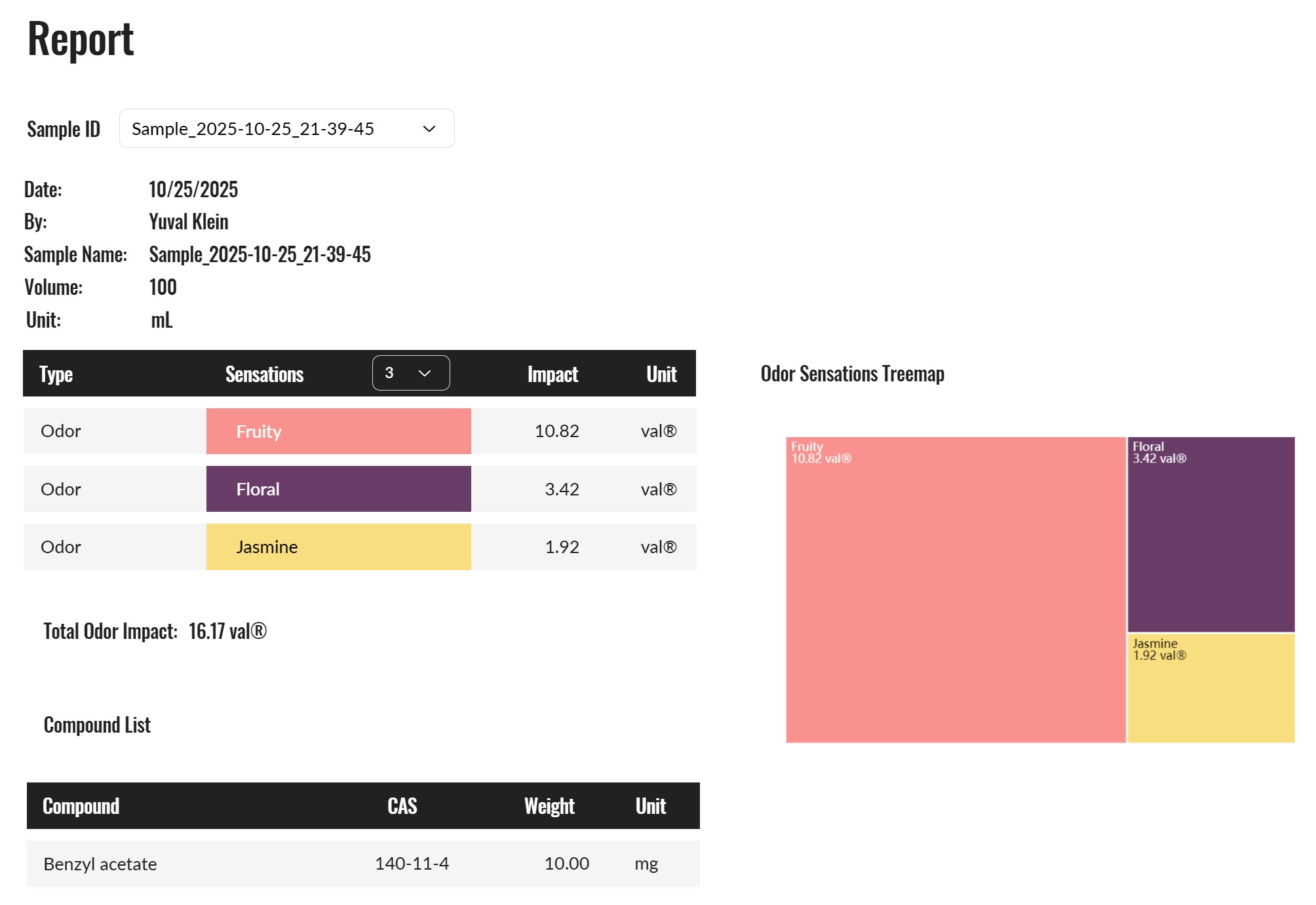 The digital organoleptic report will reflect all compounds in the selected mix and present the overall impact.
